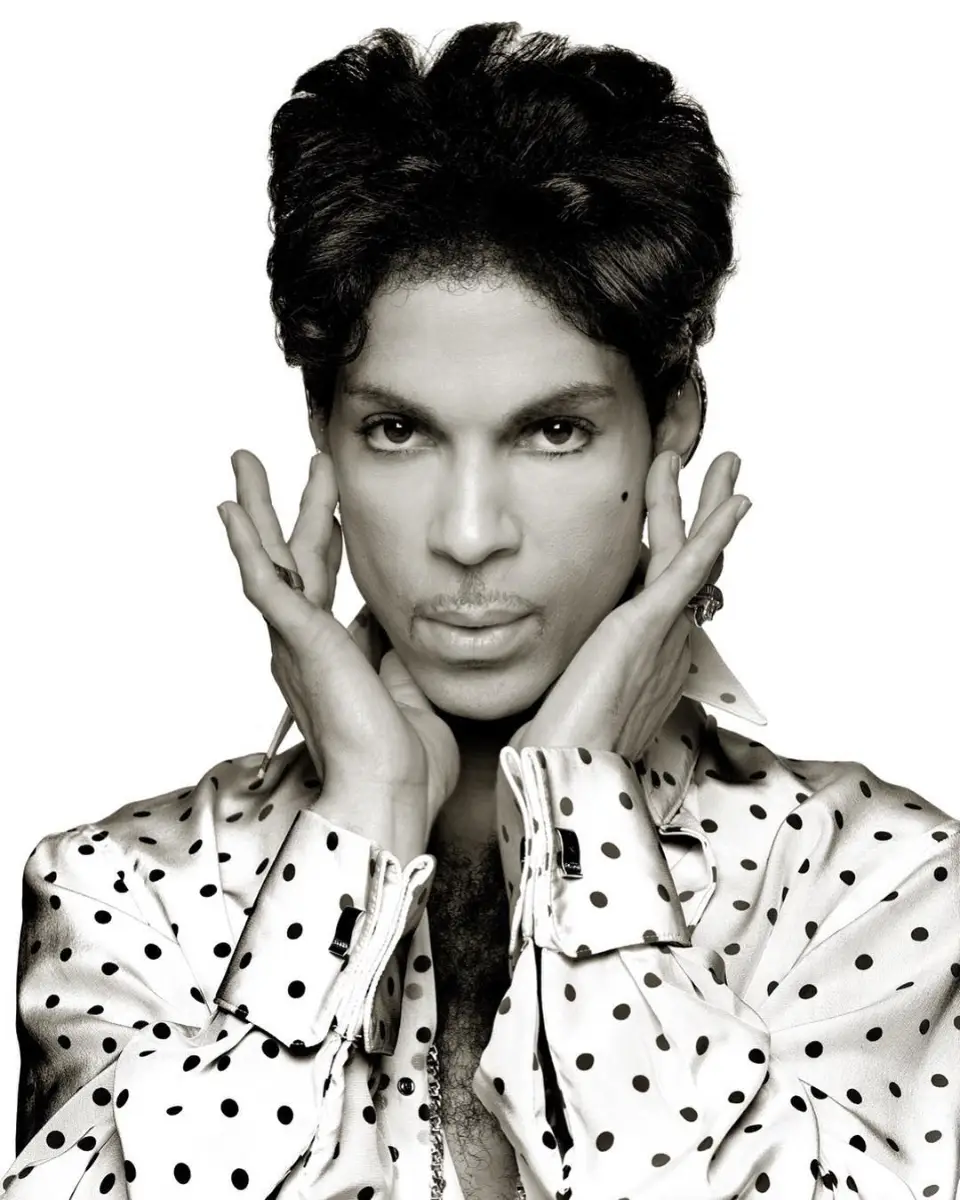 Amazing black and white portrait of legendary singer and rock star Prince in dotted shirt.