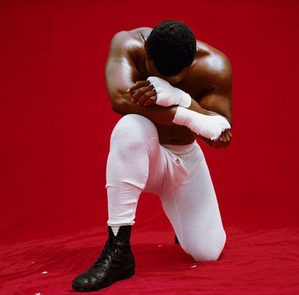 Portrait of the sport boxing legend in front of a red backround, kneeled and looking down.